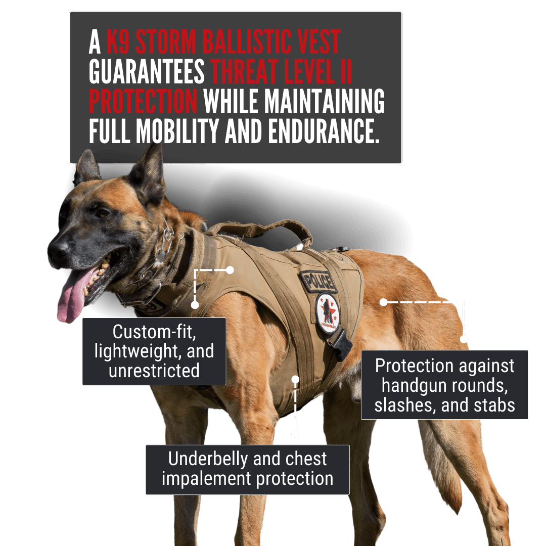 Currently, K9s are being deployed to provide critical, non-lethal support in high-risk, unpredictable situations. Yet, even without ballistic protection, they courageously track compromised buildings, navigate harsh environments, and apprehend armed suspects to keep their communities safe. They deserve the same protection as their human partners. With each day they train and work without a vest, the risk to their safety grows.